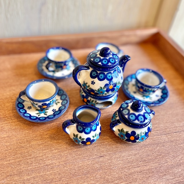 ポーリッシュポタリーをそのまま小さく再現した、ミニチュアティーセットです。 飾って置くだけでも可愛いですが、 テーブルサイドで実際に ソース入れなどにお使いいただくのも 可愛いですね♪ ドールの小物などにも いかがでしょうか? *セット内容* ティーポット ×1 ポットウォーマー ×1 シュガーポット ×1 クリーマー ×1 カップ&ソーサー ×4 ティーポット:高さ約6cm ポットウォーマー:直径約5.5cm シュガーポット:高さ約⒋5cm クリーマー:⒊5cm カップ:口径約3.8cm 高さ約2cm ソーサー:直径約7cm Ceramika Artystyczna VENA handmade in ポーランド [安全なボレスワヴィエツ陶器] ポーリッシュポタリーはポーランドの西、ドイツとの国境近く、ボレスワヴィエツ地方で作られているポーランド食器の総称です。 製造から絵付けまでを熟練の職人さんが手作りしている陶器で、絵付けは、スタンプや筆を用いて施されています。 数多くの可愛らしいデザインがあり、コレクションとしても人気ですが、食洗機・電子レンジ・オーブンでの使用に対応していて普段使いにも適しています。丈夫で使い勝手が良く、幅広いお料理の調理・盛りつけにご活用いただけます。 毎日の生活に明るさを添えてくれます。楽しい食卓に、ぜひお使いになってみて下さい。 *すべて職人さんの手仕事で作られています。ものにより絵付けのムラや、表面の小さなくぼみやピンホール、細かな傷がございますがご理解の上お求めくださいませ。 手仕事のため、同じ品番でも一つ一つの絵柄に違いがあります。画像は、お送りする商品そのものを撮影しています。 発送方法が変更になる場合があります。ご了承下さいませ。 #ポーリッシュポタリー #ポーランド食器 #ハンドメイド #ドールハウス #ボレスワヴィエツ #オーブン可 #電子レンジ可 #食洗機可 #安全 #東欧デザイン